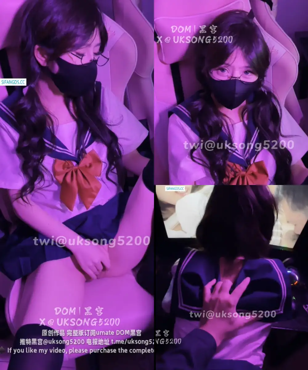 紫色霓虹在房间里慢慢晕开,像一层柔软的滤镜,把一切棱角都磨得温和而暧昧。dom黑宫安静地坐在宽大的电竞椅上,身上是一套水手服风格的cos装扮:海军蓝的领口规整地铺在肩头,胸前的橙色蝴蝶结被灯光染成淡淡的玫瑰色,短裙在她膝上轻轻铺开,深色过膝袜顺着腿部线条收紧,显得既乖巧又带着一点隐秘的叛逆感。她戴着黑色口罩和细框眼镜,长卷发从肩侧垂落下来,被椅背衬出柔软的弧度,睫毛在光影里投下一小片阴影,让人看不清她此刻的表情,只能从她微微垂下的眼眸里猜测情绪。